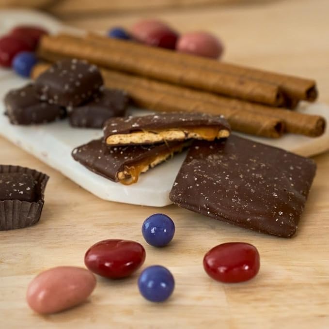 - Gourmet snacks include chocolate chip cookies (4 oz), chocolate wafer cookies (6 oz), chocolate covered grahams (2.6 oz), chocolate caramels (4.4 oz), dark chocolate sea salt caramels (1.5 oz), and chocolate covered berries mix (4 oz)!