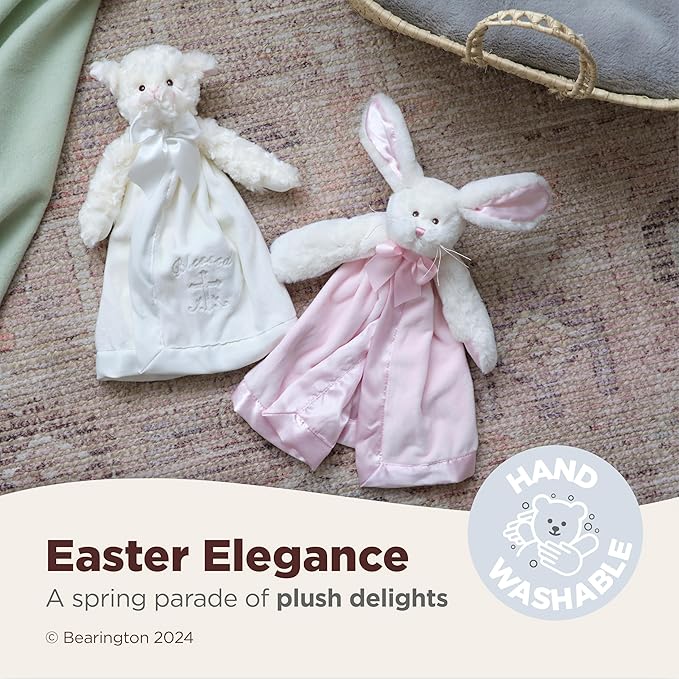 Bearington Collection Lamb Plush Security Blanket Lovey Christening Stuffed Animal - 15 in White Satin Trim - Baptism Lamb Security Blanket