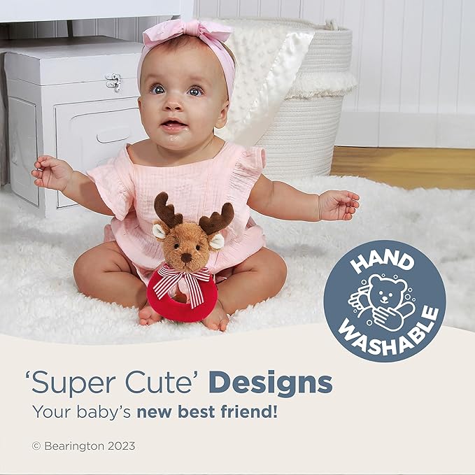 - SAFE AND RELIABLE: Crafted with utmost care, this soft rattle toy is made from high-quality materials, giving parents peace of mind. Compact and lightweight, the Bearington Baby Lil’ Reindeer rattle is designed for easy handling by tiny hands. It's a perfect travel companion, whether in the car, stroller, or crib, keeping your baby comforted and engaged wherever they go.