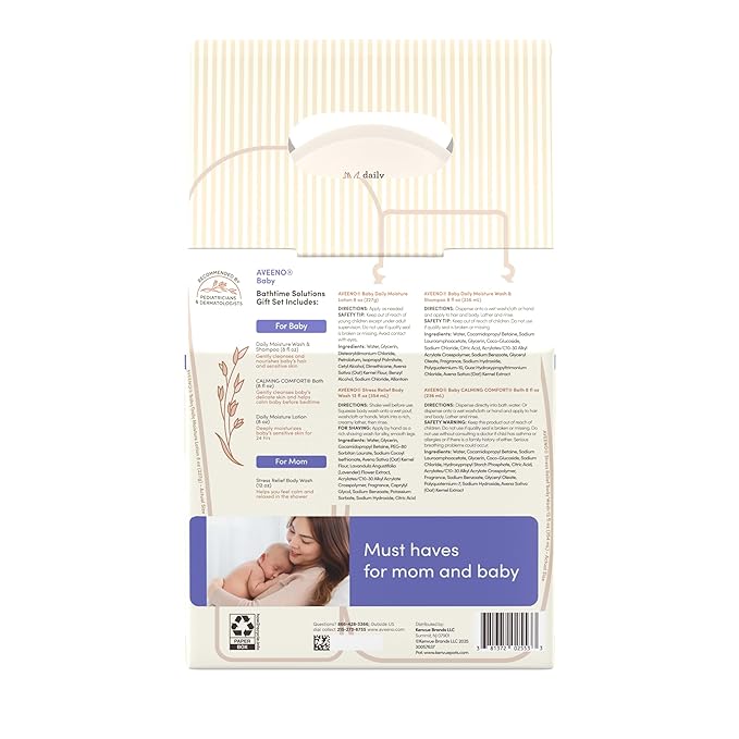 - New mom gifts set: Aveeno Baby newborn bath essentials kit relaxes & moisturizes baby & mom. Includes Aveeno Stress Relief Body Wash for mom that combines colloidal oat with scents of lavender, chamomile & ylang-ylang oils for a relaxing cleanse
