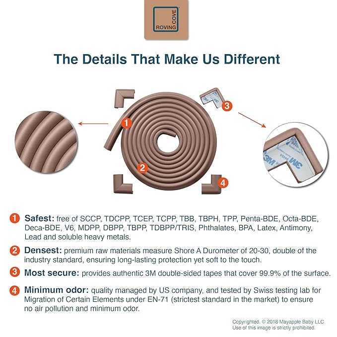 - CLEAN SAFETY: Roving Cove uses safe and pure raw material and was the first brand to make foam safety bumpers without the use of toxic flame-retardant chemicals (SCCPs). Our edge corner guards contain no BPA, no phthalates, no heavy metals, no latex, no SCCPs. Inherently flame-resistant; passed flammability tests under US regulations.