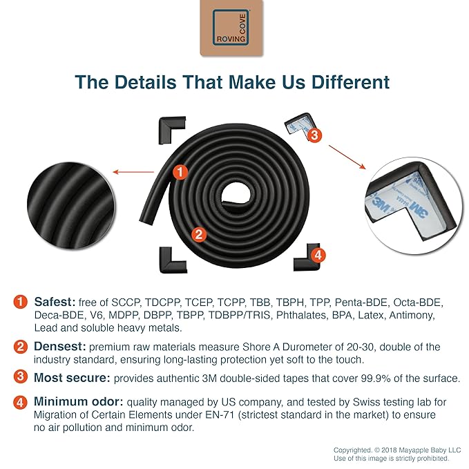 - CLEAN SAFETY: Roving Cove uses safe and pure raw material and was the first brand to make foam safety bumpers without the use of toxic flame-retardant chemicals (SCCPs). Our edge corner guards contain no BPA, no phthalates, no heavy metals, no latex, no SCCPs. Inherently flame-resistant; passed flammability tests under US regulations.