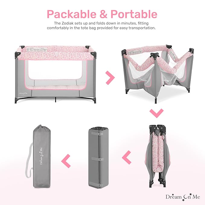 Dream On Me Zodiak Portable Playard in Grey and Pink, Lightweight, Packable and Easy Setup Baby Playard, Breathable Mesh Sides and Soft Fabric - Comes with a Removable Padded Mat