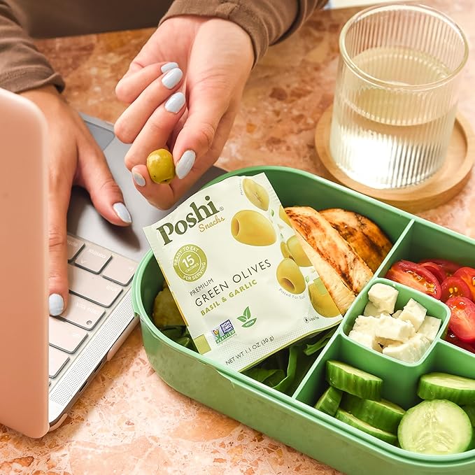 Poshi Green Pitted Olives | Basil & Garlic | Vegan, Kosher, Gluten Free + Keto Friendly, Fresh, Low Calorie Healthy Snacks | (30 Pack, 1.1oz Bags)