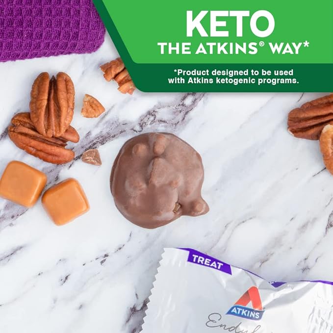 - SATISFY YOUR SWEET TOOTH. Atkins Endulge Pecan Caramel Clusters. 2g of net carbs and 2g of sugar per serving*. This is Today’s Atkins.