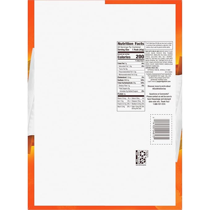 - 30 snack packs: 30-count multi-pack of Goldfish crackers cheddar snack bags