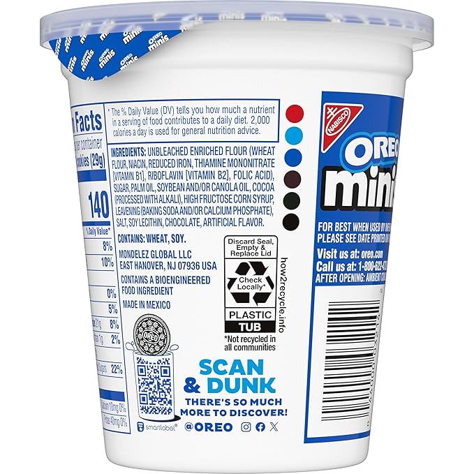 - Twelve 3.5 oz snack cups of OREO Minis Chocolate Sandwich Cookies (packaging may vary)