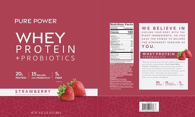 Dr. Mercola Pure Power Whey Protein + Probiotics - Supports Muscle Recovery & Digestive Health - Pasture-Raised Whey - MCTs & Fiber - Vanilla - 31 oz (22 Servings) - Strawberry