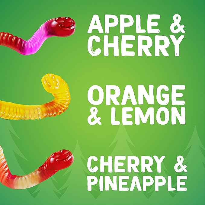 - REAL JUICY, REAL GOOD: This case includes 12 individually wrapped 4 ounce bags of gummy worms includes 3 dual sided worms with 5 fruity flavors: lemon-orange, cherry-pineapple, and cherry-apple