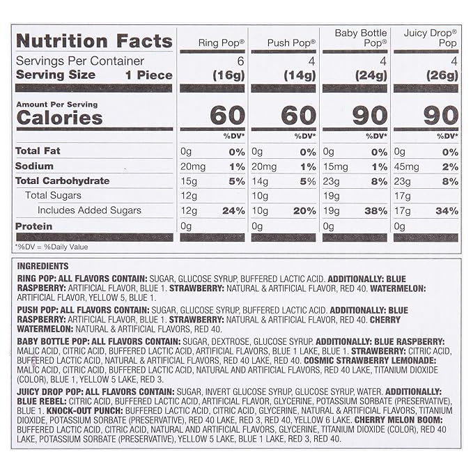 - BULK CANDY BOX: Our 18-count variety box brims with childhood favorites, featuring 6 Ring Pops, 4 Push Pops, 4 Baby Bottle Pops, and 4 Juicy Drops, a perfect hit for both bulk candy enthusiasts and casual snackers.