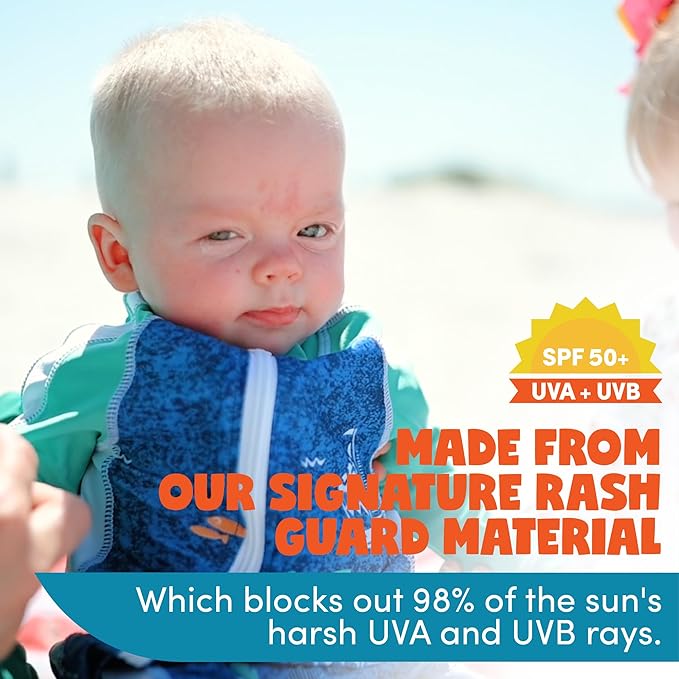 - TOTAL SUN PROTECTION: SwimZip's famous sunsuit offers full-length sleeves and leg coverage to block the sun's harmful rays from the skin of baby boys (up to little boys age 6). Cover up instead of lathering up with chemical suncreens! Our sunsuits are made from our signature UPF 50+ (SPF 50+) rash guard material, which blocks out 98% of the sun's harsh UVA and UVB rays. It's saltwater- and chlorine-resistant, quick drying, breathable, and offers 4-way stretch!