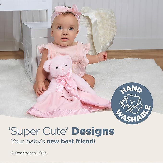 - Cuddle Buddy For Babies: Meet the Huggie Bear Snuggler Lovey, perfect for your little one's special moments at home. This ultra-soft, plush, pink animal security blanket for girls measures 15" and offers cuddles and comfort. Crafted with love, it's a newborn safe teddy bear blanket that soothes your baby and is easy to care for with its machine washable design