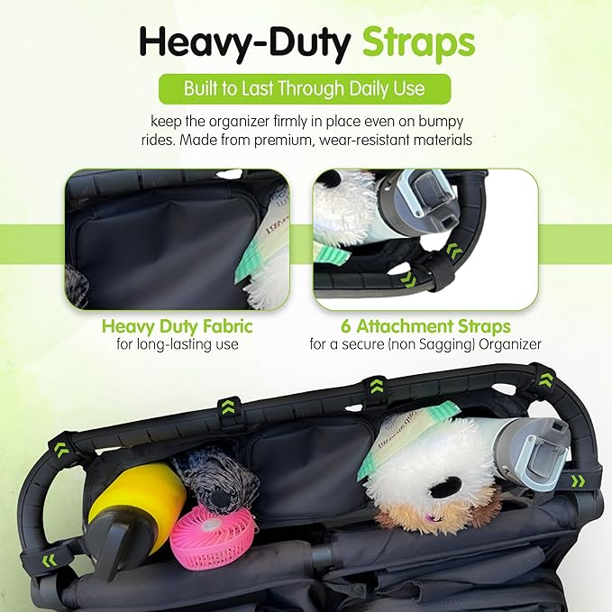 - Heavy-Duty Straps: Six durable Velcro straps secure the organizer to your stroller, with the option to trim for a cleaner look