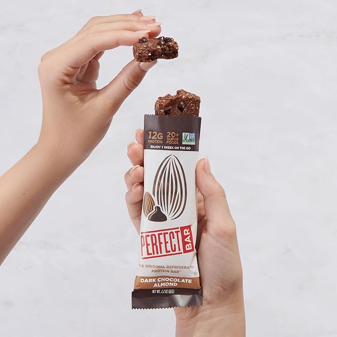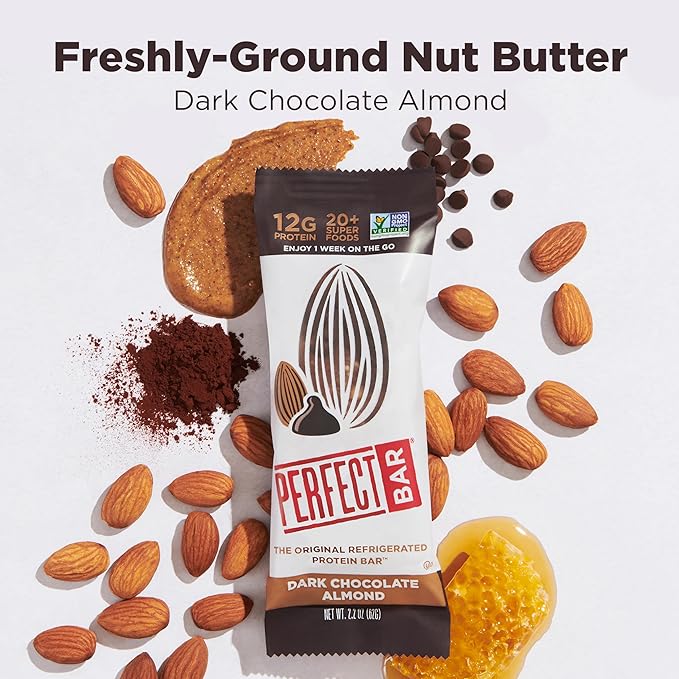 - DARK CHOCOLATE ALMOND PROTEIN BAR: Made with ground nut butters & organic honey, Perfect Bar is a delicious blend of creamy and crunchy with a cookie-dough-like texture. Nutritious, delicious & truly tasty!