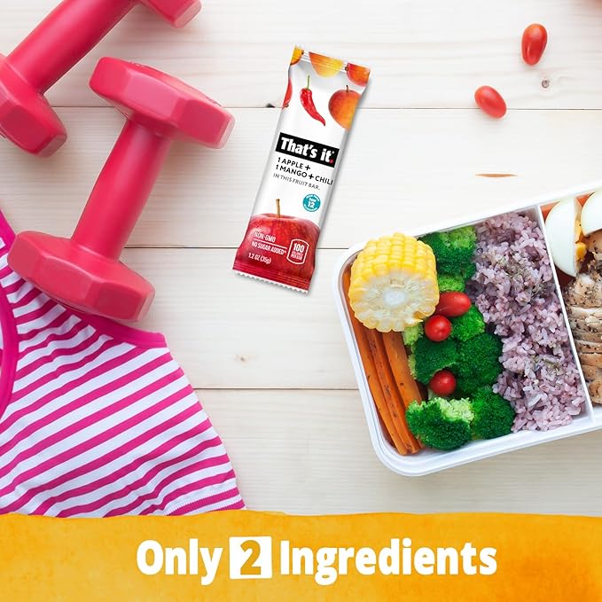 - A ZESTY ZING ON TRADITIONAL FRUIT BARS: We make it convenient and fun to get your two whole servings of fruit just from one That’s It. Fruit Bar, now with a hint of zesty goodness in every bite. No washing or peeling required, try this fun and exciting twist on fruit in many more combinations, from Apple to Apricot, Banana, Cinnamon, Coconut, Dates, Mango+Chili, Pear, Pear+Ginger and Pineapple.