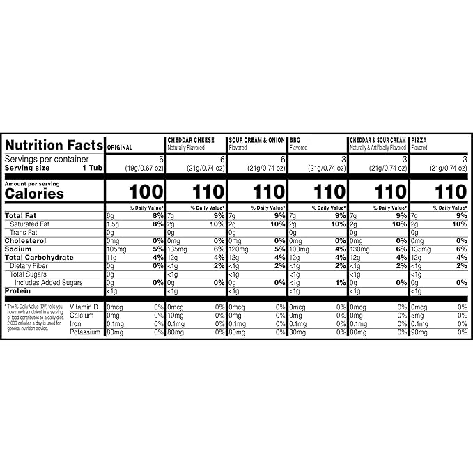 - Variety pack includes 27 cups of ready to eat potato crisps; Original (six), Sour Cream and Onion (six), Cheddar Cheese (six), BBQ (three), Cheddar and Sour Cream (three), and Pizza (three)