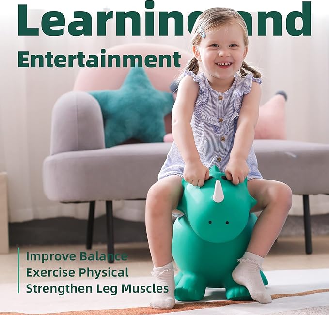 - 【Original and Cute Design】Featuring a popular dinosaur shape, this little blue dino hopper is perfect for kids, just ride on it and enjoy pretend-play while also burning off extra energy through exercise, Supervise your baby while playing if your little one is under 2 years old.