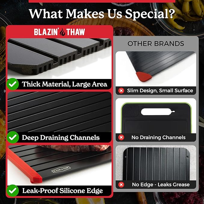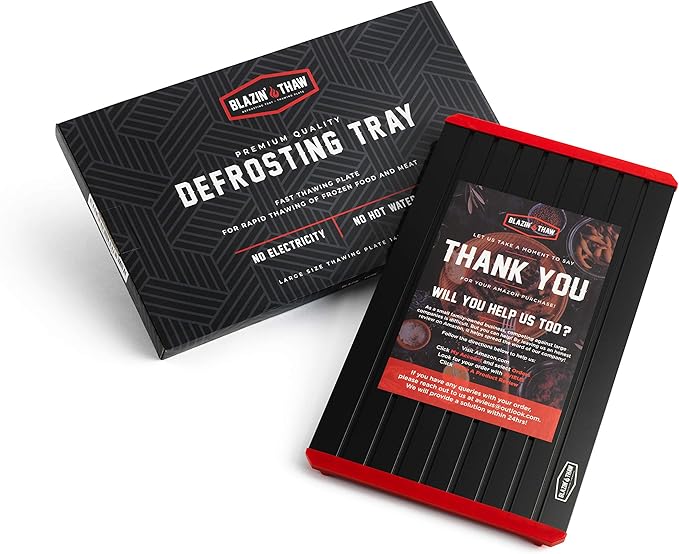 - 【THAWING MADE EASY】Say goodbye to time-consuming thawing methods! The Blazin' Thaw Defrosting Tray's innovative design harnesses the power of premium-grade aluminium to safely and naturally thaw your frozen foods. No more compromises on taste or nutrition!