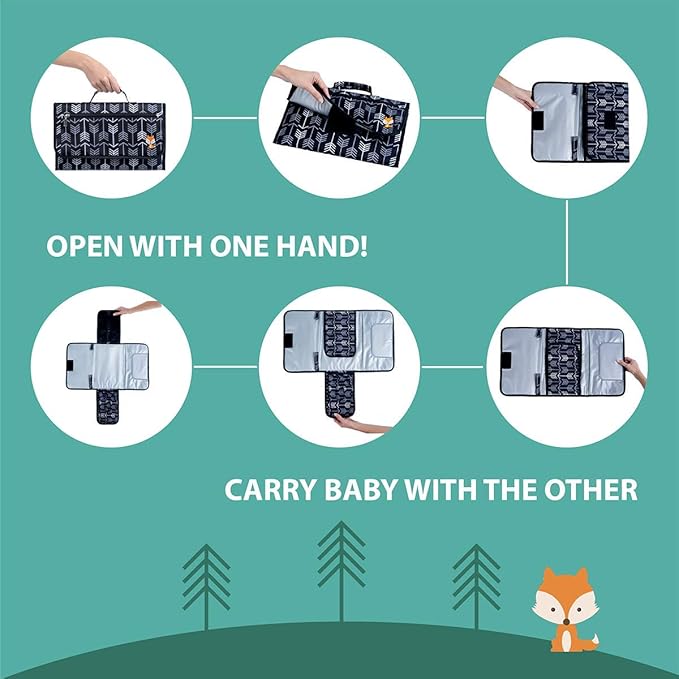 - OUTFOXES THE REST: The Lil Fox Portable Changing Pad is made with water-wicking 300D PU on the outside and Waterproof PEVA on the inside, making it easy to wipe clean. It comes in a stylish arrow print design that moms and dads can proudly show off. It also makes a perfect gender-neutral Baby Shower Gift for Baby girls or boys. When folded, it measures 13.8 x 8.4" and can fit in any bag or Diaper backpack. It also has a Diaper clutch strap for easy attachment to your stroller, wrist, or toys.