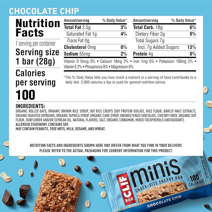 CLIF BAR Minis - Chocolate Chip - Made with Organic Oats - 4g Protein - Non-GMO - Plant Based - Snack-Size Energy Bars - 0.99 oz. (20 Pack)