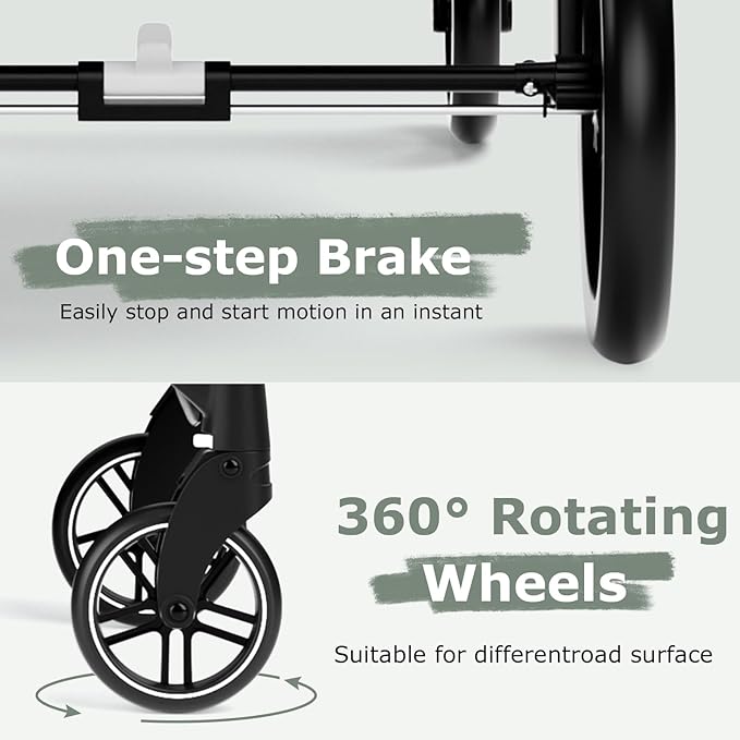 - 360 DEGREE ROTATE FRONT WHEELS & LOCKABLE REAR WHEELS: We use shock absorbing design for our baby stroller’s wheel to provide your baby a smooth ride over all types of everyday terrain. The front wheels can rotate 360 degree for you to adjust the direction easily and the buttons on the front wheels are design for fixed orientation if necessary. And the rear wheels of our stroller are lockable that you can rapidly control it with the foot-activated brake.