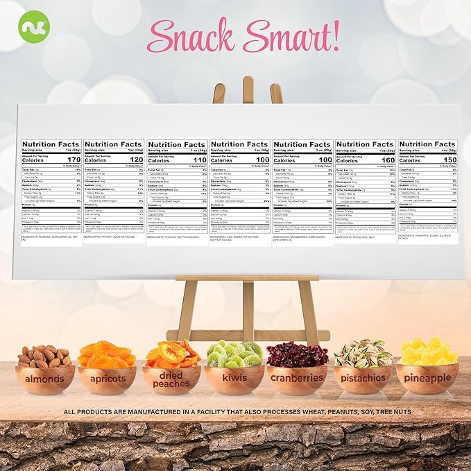 - TRY OUR SIGNATURE SELECTION OF NUTS & DRIED FRUITS: Our Easter Gift Box includes a handful of each of our 7 signature delicious nuts & dried fruits: Dried Cranberries, Dried Peaches, Dried Pineapple, Dried Apricots, Dried Kiwis, Salted Roasted Almonds and Salted Roasted Pistachios. All naturally grown and handpicked by our farmers around the world.