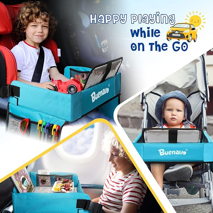 BUENAVO [New Version] Car Seat Organizer Kids Travel Tray for Kids Toddlers Activities in Car Seat, Stroller, Airplane | Waterproof Dry Erase Top | Side Pocket & Water Bottle Holder