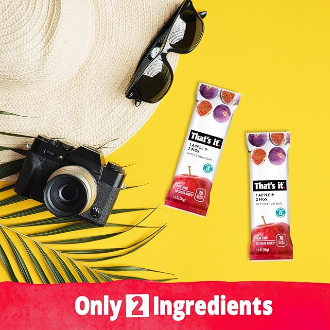 - HEALTHY SNACKING ON THE GO: 87% of Americans are not getting their daily recommended fruit intake, so toss That’s It. Fruit Bars in your gym bag or child’s lunchbox for balanced nutrition on-the-go, or try infusing with other recipes. Great for weight management, these bars are only 100 calories and contain vitamins A and C, 3g fiber, and are the purest alternative to nearly every bar, snack, juice, granola, fruit strips, fruit bits, and dried fruit.