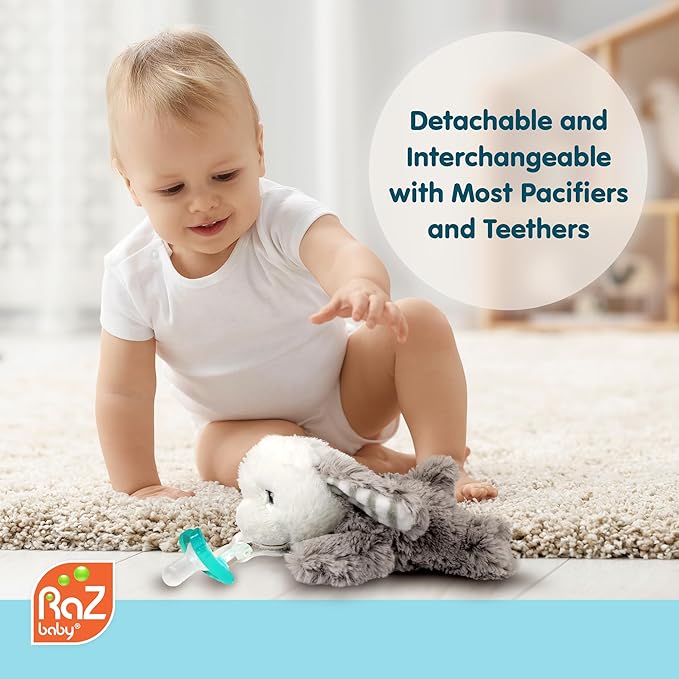 - Easy to Clean & Sterilize: The RaZbuddy plush is machine washable for effortless maintenance, while the detachable JollyPop pacifier should be sterilized first, then dishwasher-safe for easy cleaning and convenient attachment swaps.
