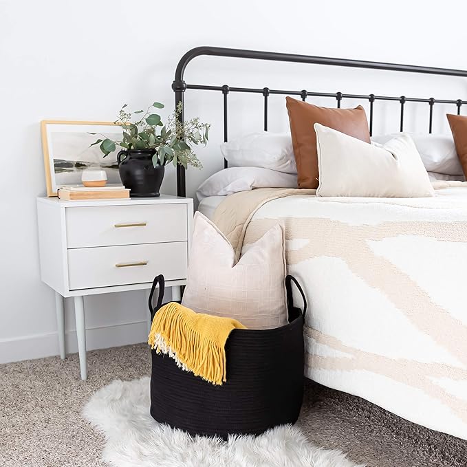 OrganiHaus Large Laundry Basket, Woven Cotton Rope Basket for Blankets, Toy Storage, Nursery Hamper, Living Room Decor Organizer, Soft & Durable Hamper with Handles, 20x13 inches - Black