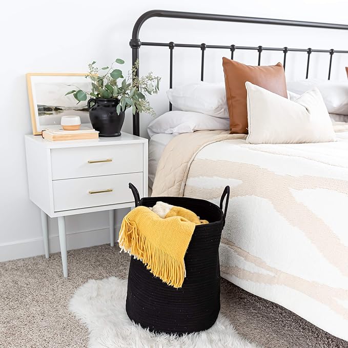 OrganiHaus Large Laundry Basket, Woven Cotton Rope Basket for Blankets, Toy Storage, Nursery Hamper, Living Room Decor Organizer, Soft & Durable Hamper with Handles, 15x18 inches - Black