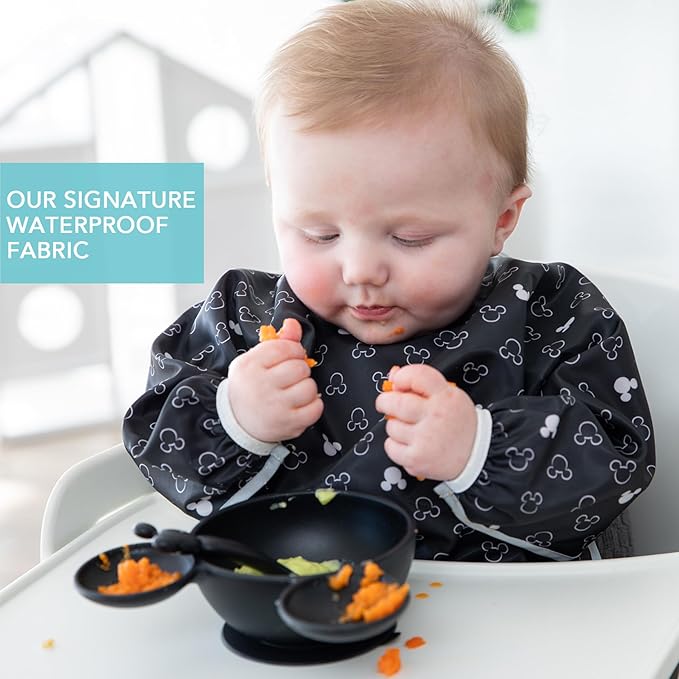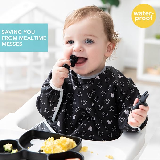 Bumkins Disney Bibs, Baby and Toddler Girls and Boys 6-24 Months, Long Sleeve, Essential Must Have for Eating, Feeding, Mess Saving Lightweight Waterproof Fabric Sleeved Smock, Mickey Mouse Icon