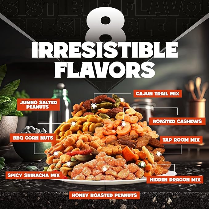 - Unbeatable Variety: This nuts gift basket packs an incredible assortment of 8 unique nut flavors including cashews, peanuts, macadamia nuts, and almonds in a selection of salted, roasted, BBQ, and candied varieties