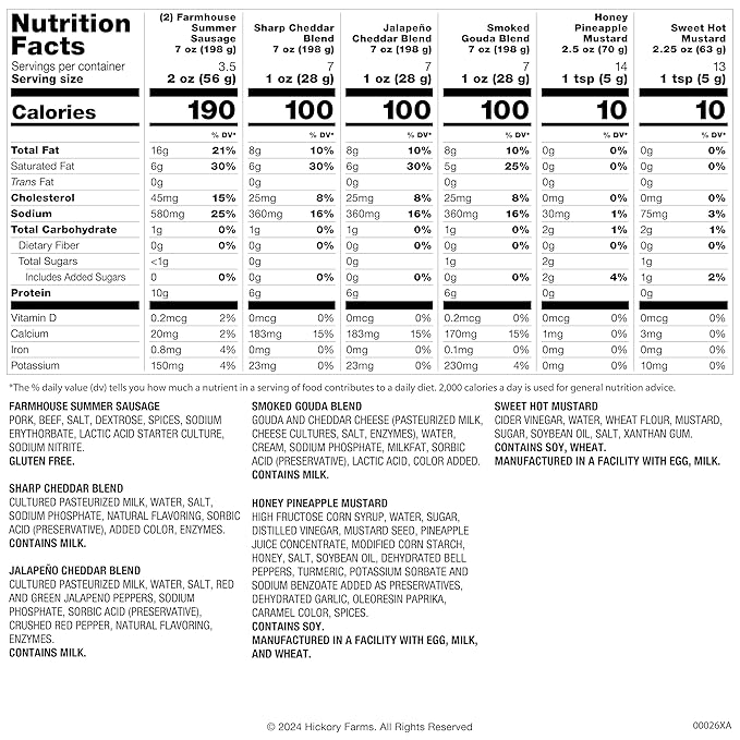 - Meat & Cheese: 7 oz Farmhouse Summer Sausage, 7 oz Jalapeño Cheddar Blend, 7 oz Sharp Cheddar Blend, 7 oz Smoked Gouda Blend
