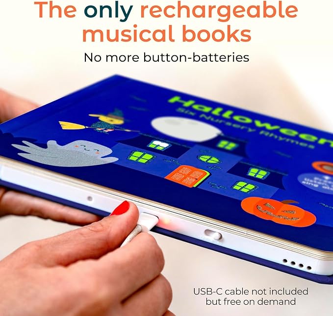 - USB-C Rechargeable: Skip the hassle of batteries with this USB-C rechargeable sound book while saving money on batteries. Convenient, fast, and charging ensures your child’s Halloween fun never ends. Cable not included