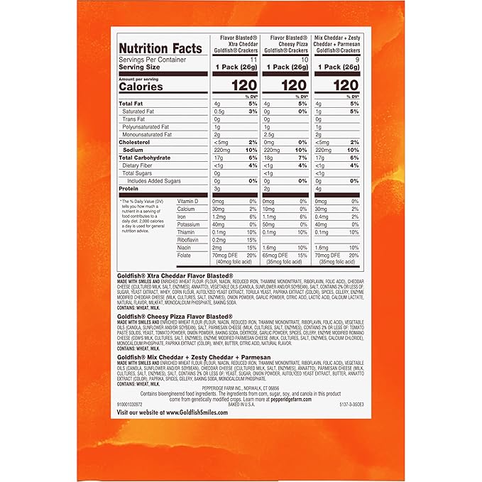 - Includes: 9 packs of Goldfish mix cheddar/zesty cheddar/parmesan, 11 packs of Goldfish flavor blasted xtra cheddar, 10 packs of Goldfish flavor blasted cheesy pizza