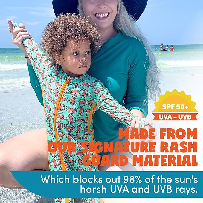 • ULTRA COMFORT AND EASY CARE: Raglan cut sleeves for enhanced mobility and flatlock seams throughout the bathing suit provide for ultimate comfort and durability of the toddler swimsuit for boys giving full, free range of motion. Simply machine wash, line dry and your baby is ready to enjoy another day protected from the sun in this infant swimsuit.