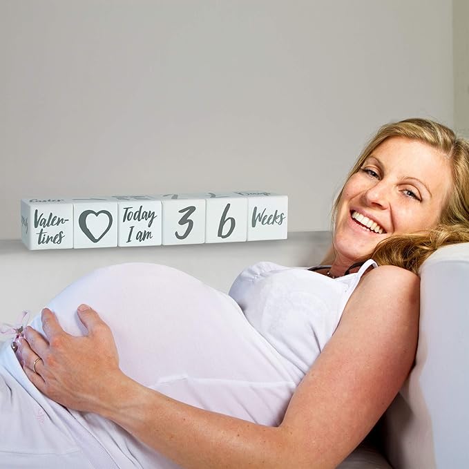 - A set of 6 solid wood printed with large numbers 0-9, 8 significant milestones, 5 popular holidays, 7 growth measurement classifiers; Days, Weeks, Months, Years, Lbs, Inches, Grade, and emoji lovely graphics. Includes cute sayings; Today I am 8 Months, My first Smile, My first Christmas, and more. Possible to make number combinations of age range from birth to adult. Awesome for weekly pregnancy countdown or tracking baby's important milestone. Each cube is 2.4 x 2.4 x 2.4 inches.