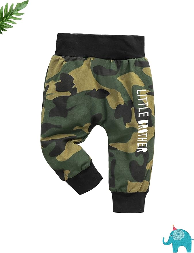 - 💖Design:Let your little one make a statement with this stylish baby boy's clothes set. The camouflage hooded top is printed with a 'little brother' monogram print, giving it a cool and stylish look. The army green camouflage pants also feature a "little brother" monogram print, adding a touch of uniqueness to the set. This outfit is perfect for your baby boy to make a statement while remaining comfortable and stylish.