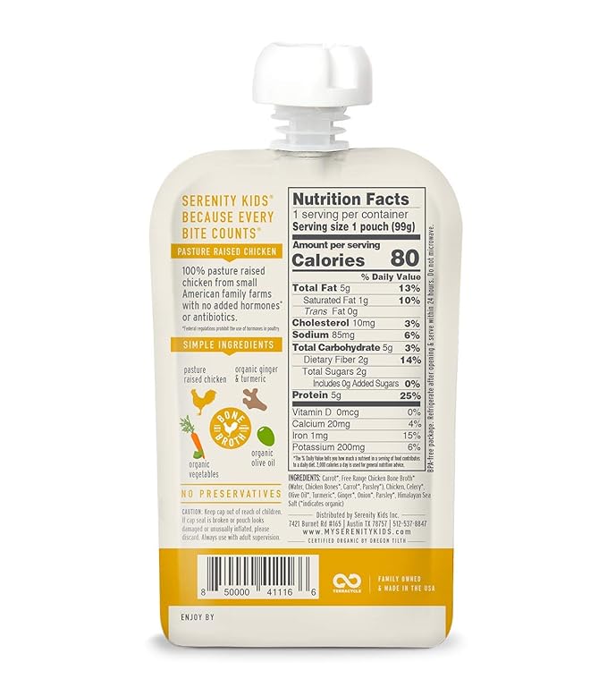 - Serenity Kids Flavor Adventure: Dive into the bold flavors of Serenity Kids Organic Turmeric Chicken Bone Broth. This chicken baby food pouch is a tasty fall toddler meal with pasture-raised chicken and organic veggies, making meal times a delicious adventure
