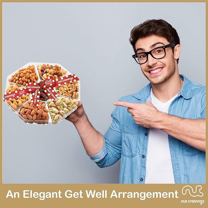 - TOP 'NUTCH' PACKAGING WITH GET WELL SOON MOTIVE: High-end packaging featuring a unique and sophisticated design and an elegant "Get Well" red ribbon. Plus, our nuts come in a covered sturdy and clear 7 sectional hexagon shaped tray that makes it easy for you to share them with the people you love.