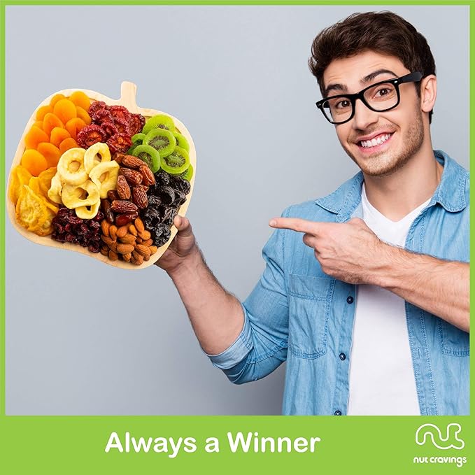 - A SELECTION OF 8 OF OUR BEST DRIED FRUITS + ALMONDS: Our Apple-shaped Wooden Tray Gift Basket includes a handful of Almonds and of 8 of our signature delicious dried fruits: Pitted dates, Pitted Prunes, Dried Angelino Plums, Dried Cranberries, Dried Kiwi, Dried Apple, Dried Appricot, and Dried Pear.