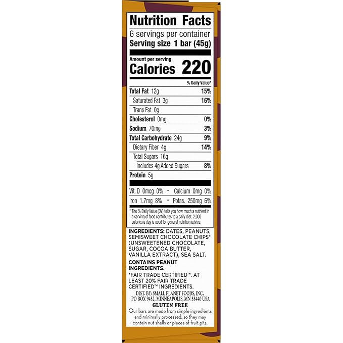 - FOUR SIMPLE INGREDIENTS: Larabar Peanut Butter Chocolate Chip Bars are keeping it real; Made from dates, peanuts, semisweet chocolate chips (Fair Trade Certified by Fair Trade USA; at least 20% Fair Trade Certified ingredients), and sea salt