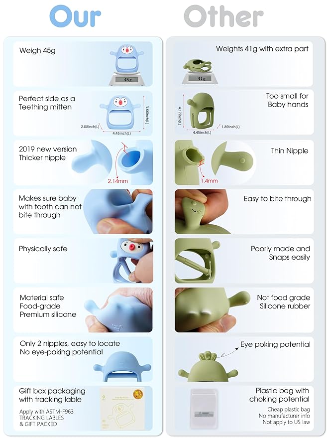 - 【BEST TEETHER FOR 3-6MONTHS BABIES】:For 0-6Months babies, sucking is calming. At the same time, baby start teething around 3Months old. This penguin teether is designed for sucking with the shape to mimic natural latch feelings, works as a pacifier. At teh same time, our PACIFIER part is MUCH THICKER than other soothers, which is more chewy and durable for baby to rubbling and massaging sore gum from constantly pulling the teether for early teething pain relief. Its thick and chewy nipple part makes sure it is safe for 6-12months babies with tooth to chew on it.