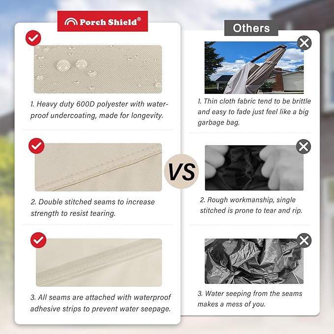 - Fadeproof & Waterproof Material - It is made of 600D tough polyester with waterproof undercoating. UV resistant treatment makes it stay vibrant for years. Enhanced with double stitched and sealed seams to prevent the umbrella cover against sun, rain, snow, wind, and dust.