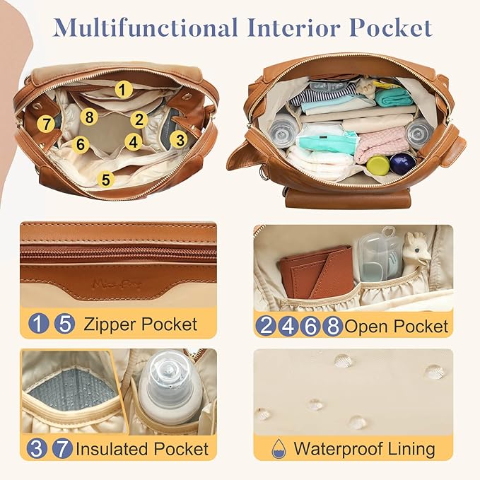 - ❤️【Stylish & Practical】miss fong Diaper Bag is a artful balance of fashion and practicality. It's always the choice in baby registry search,gift option in baby shower. Leather diaper bag material:Outer--100% soft vegan Leather,comfortable touch, more easier to clean, will not easily crease or break. Inner-100% waterproof, wipeable and stain-resistant nylon. Backpack Straps-vegan leather. Handle straps-Pu leather. Hardware-18K Gold. Bottle warmer: thermal insulation materials.