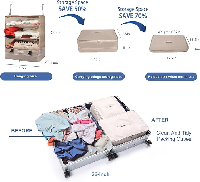 TABITORA Portable Hanging Travel Shelves Bag Packing Cube Organizer Suitcase Storage Large Capacity (Beige XL)…
