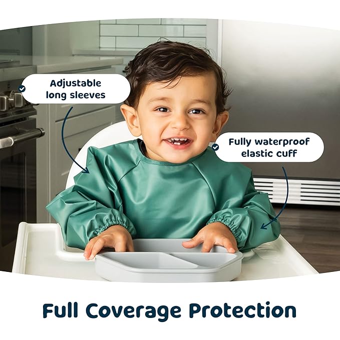- TRAVEL BUDDY:TRAVEL BUDDY:The must-have baby feeding essentials for on-the-go parents! Our long sleeve waterproof smock bib (fits 6-24 months) is a versatile wipeable bibs with scratch-free closures and 360 degrees puree-proof protection.This bib with sleeves is perfect for plane or car meals, It folds flat in diaper bags,handles baby-led weaning messes and makes a great gender-neutral baby shower gift.Ideal for parents needing baby eating essentials on the go.