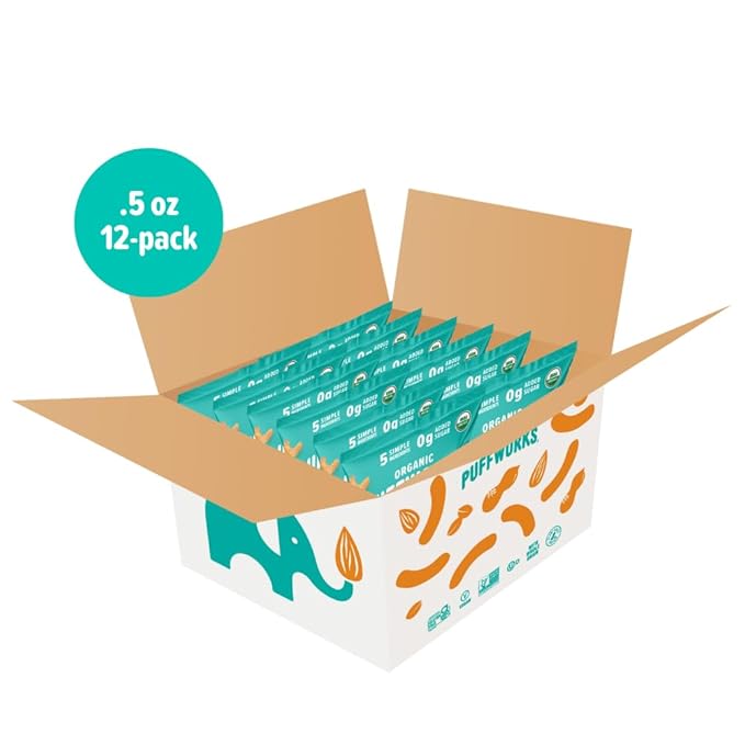 Puffworks Baby Organic Almond Butter Puffs, with Peanut Butter, Plant-Based Protein, USDA Organic, Gluten-Free, Vegan, Non-GMO, Kosher, 0.5 Ounce (Pack of 12)