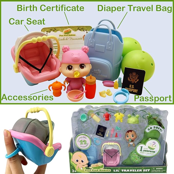 Nature Bound Pea Pod Babies Twenty Two Piece Little Traveler Playset - Collectible Mystery Surprise Toy with Mini Baby, Clothing, & Accessories - All in A Soft Pea Pod - Small Doll, Ages 3+